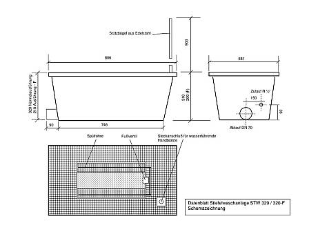 ohne Schlammfang und Geruchsverschluss, mit Kunststoffwanne mit feuerverzinktem Gitterrost; durch Betätigung eines Fußventils wird auch die Wasserzufuhr je nach Einstellungszeit geöffnet, bei Nichtgebrauch ist diese Anlage ohne jedes Hindernis voll begehbar, im Lieferumfang enthalten ist eine Handbürste STW-HB sowie ein Haltegriff; Wasseranschluss: R 1/2" Ablauf DN 70; Abmessungen Wanne: 886x581 mm, Tiefe STW320: 320 mm, Tiefe STW320F: 210 mm;