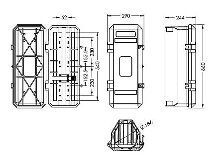 Truckbox, schützt vor Nässe und Verschmutzung von Feuerlöschern, Verwendung im KFZ-Bereich und Innen und Ausßenbereich, Material Polyurethan gespritzt, Farbe schwarz, rundumlaufende Gummidichtung, Prüffenster, zwei Gummiverschlüsse, Befestigung wahlweise senkrecht oder horizontal,